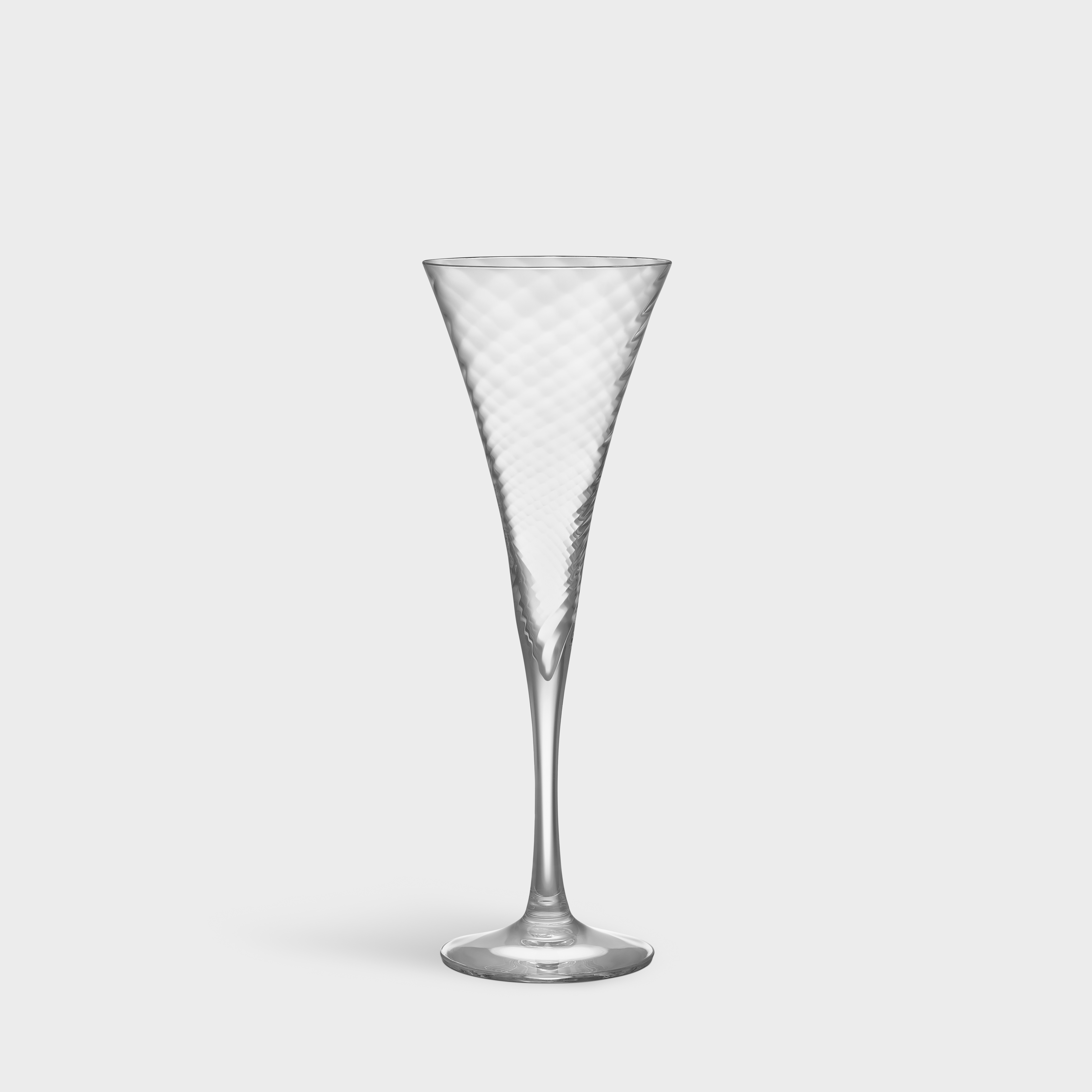 Helena Champagne holds 25 cl and has been part of the Orrefors assortment since 1977. The diagonal line pattern on the surface of the trumpet-shaped bowl creates a beautiful optical effect. Design by Gunnar Cyrén.